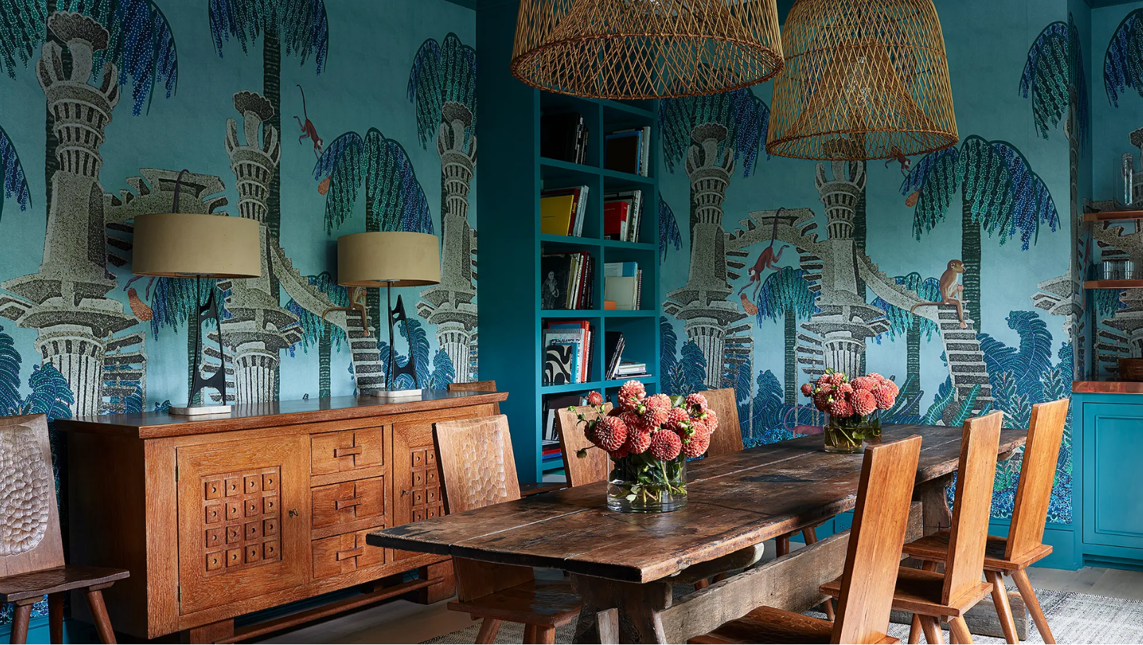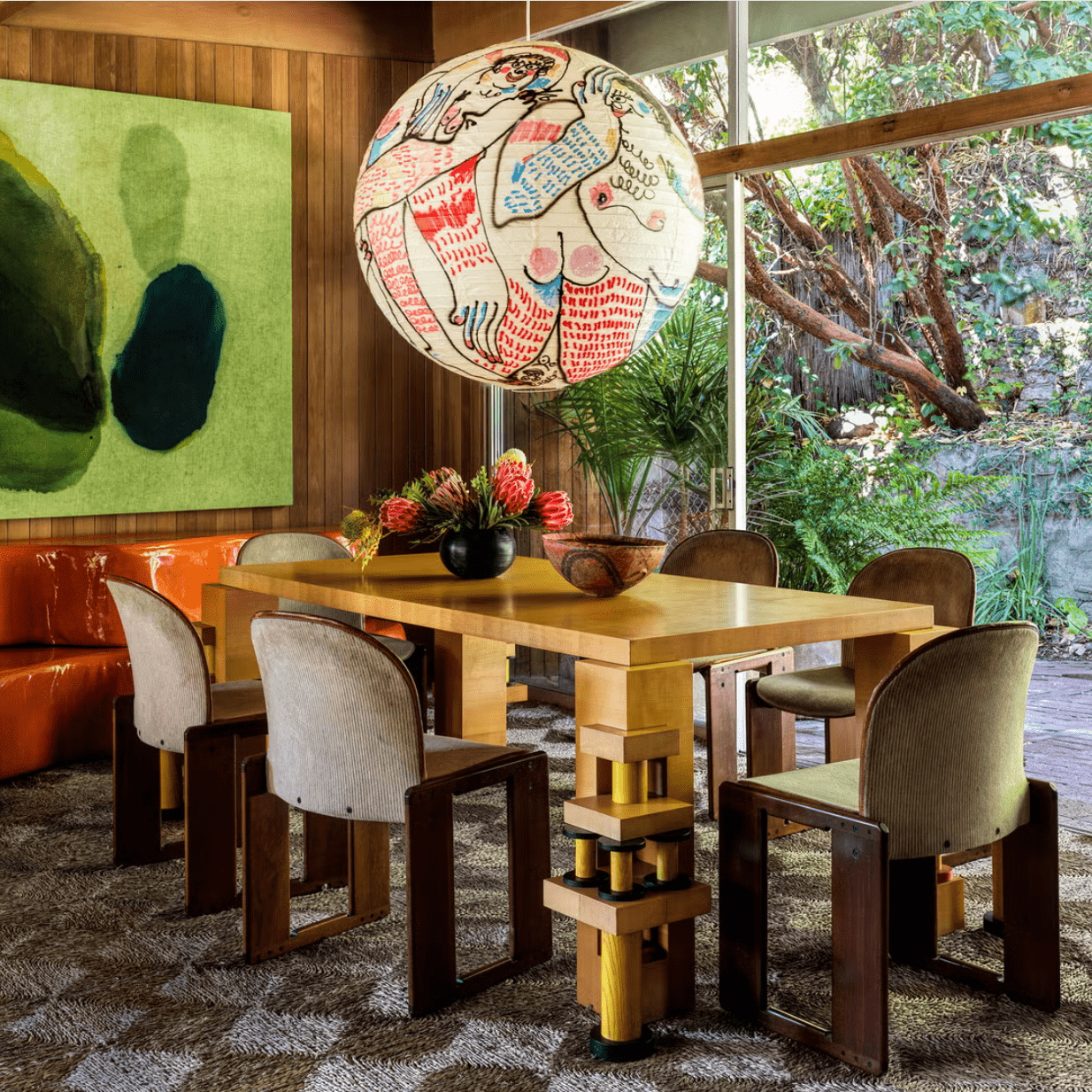 - Oversized sculptural pendants that anchor the table