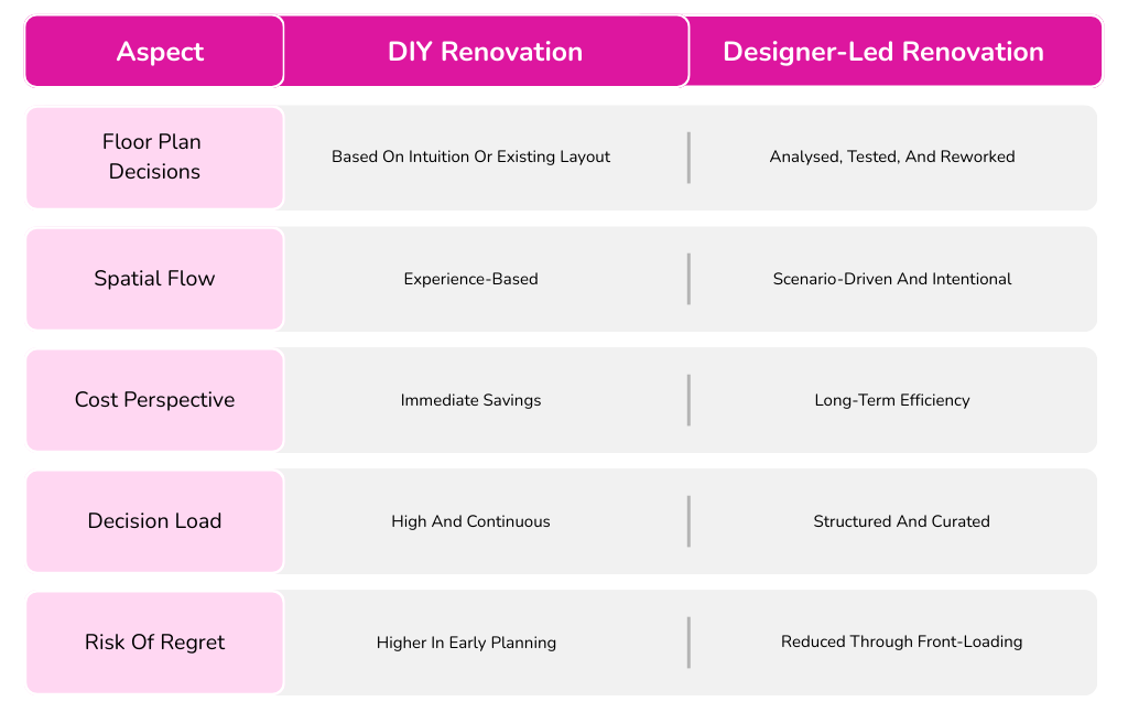 Whether a renovation is self-managed or designer-led, the floor plan is the decision that outlasts every other choice. Paint colours change. Furniture moves. Even cabinetry can be replaced. But circulation, adjacencies, and spatial proportions are far harder to undo once construction begins.